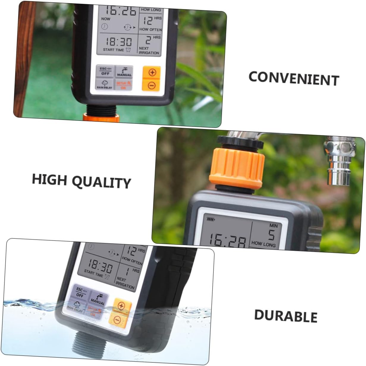 • Garden irrigation timer--manual rain delay function is also accessible to save water in (the programmed watering time will be delayed by an interval),Garden Watering Timer