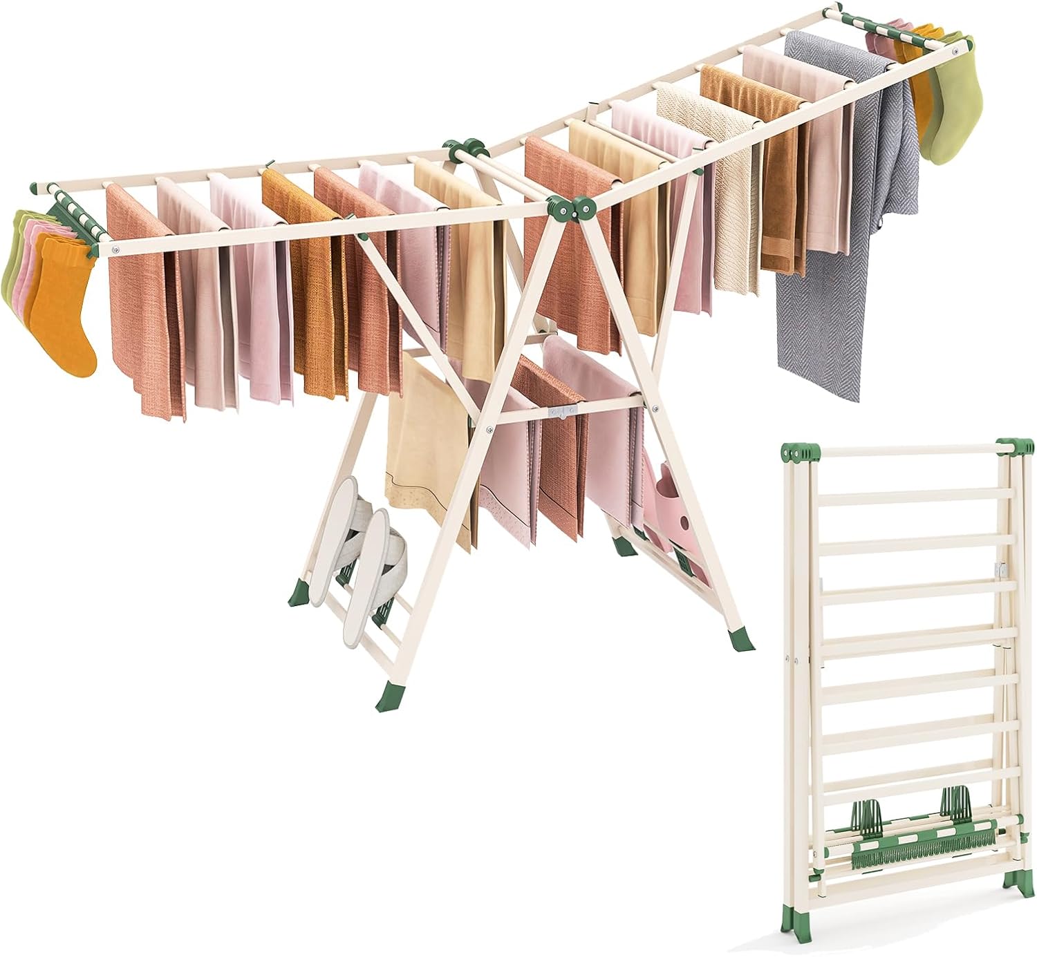 Description:This foldable clothes drying rack has two large frames with 16 clothes hangers, 28 sock holders and 4 shoe racks. This way, you can dry all your clothes simultaneously. Besides, the wings of the drying rack can be adjusted so that you can dry different clothes more easily. Our drying rack is made of sturdy steel and can withstand a maximum weight of 90 pounds. Moreover, its no-installation design allows you to use it immediately after receiving the package. Last but not least, this drying rack can be folded when not in use, so you can easily store it behind the door or under the bed. This is a perfect choice for small spaces like balconies or dorm room areas.Feature:Sufficient space for clothes, socks, shoesEnough drying area with 3.3" reasonable spacingHeight-adjustable wings accommodate garments of varying lengthsAnti-slip foot pads enhance stabilityFoldable design allows for quick setup and storageIdeal for use in laundry rooms, apartments, rvsReady to use right out of the box with no assembly requiredSpecification:Color: Beige/WhiteMaterial: MetalOverall Dimensions: 55.5" x 22" x 39"-58"/64" x 22" x 39"-62"/72.5" x 22" x 39"-66" (L x W x H)Folding Dimensions: 22" x 5" x 42" (L x W x H)Dimensions of Bottom Drying Area: 15.5" x 17" (L x W)Height from Bottom Drying Area to Ground: 21"Max. Weight Capacity: 90 lbsNet Weight: 13/14 lbsPackage includes:1 x Clothes Drying Rack1 x User's Manual