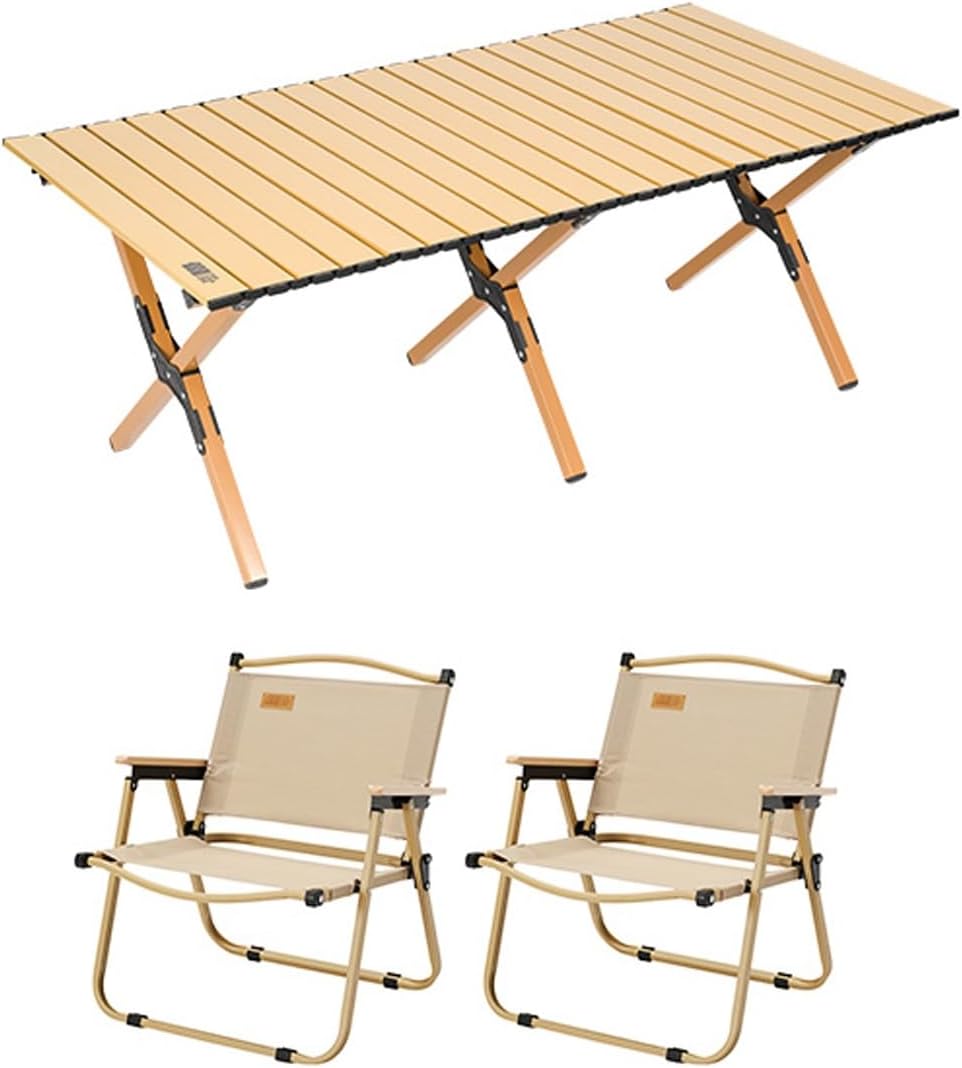 Welcome to my shop~This foldable camping table is made of thickened carbon steel, offering a sturdy and durable structure and a smooth, flat surface. It's lightweight and compact, making it easy to carry and store. The spacious tabletop easily accommodates a variety of items, making it a great outdoor storage companion.This camping table features thickened legs and a triangular mechanical structure, capable of supporting up to 170kg while maintaining stability. It sets up in 60 seconds and easily stores away. It comes with a carrying bag, making it lightweight and portable, making it suitable for a variety of outdoor occasions, including camping and events.- Name: Outdoor Folding Table and Chair Set- Color: Khaki- Material: Carbon Steel, Oxford Cloth- Table Dimensions: 90*60*46cm/35.4*23.6*18.1in, 120*60*46cm/47.2*23.6*18.1in, 150*60*46cm/59*23.6*18.1in- Chair Dimensions: 57*53*60cm/22.4*20.9*23.6in, 69*54*77cm/27.2*21.3*30.3in- Suitable for a variety of outdoor occasions: camping, picnics, family outings, garden parties, RV vacations, hiking, fishing, barbecues, travel, and parks.- Includes: Folding camp chairs, folding table, and carrying/storage bag.Safety warning: When used outdoors, chairs must not exceed a weight of 100 kg and tables must not exceed a weight of 75 kg. Please ensure that the table is properly installed and secured.