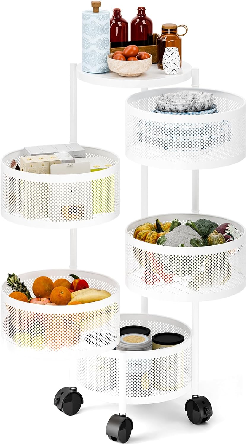 • 🛒【Large Capacity & Space Saving】The fruit cart has 3 layers of storage space and a large capacity. The diameter of each round storage basket is approximately 11.81 inches, suitable for most sizes of items. The rotating kitchen storage rack is 11.81 inches long, 11.81 inches wide, and 23.62 inches high. It is compact and can be easily moved to small spaces such as kitchen corners, saving you space.